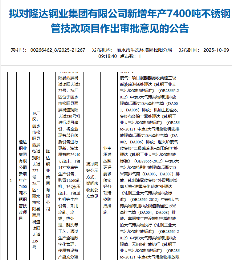 2025年10月9日,麗水市生態(tài)環(huán)境局松陽分局擬對隆達鋼業(yè)集團有限公司新增年產(chǎn)7400噸不銹鋼管技改項目作出審批意見并對外進行公告,公告期為:2025年10月9日至2025年10月14日(5個工作日)。
