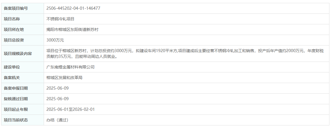 2025年6月9日,揭陽市榕城區(qū)東陽街道新蘇村不銹鋼冷軋項目備案復(fù)核獲通過。